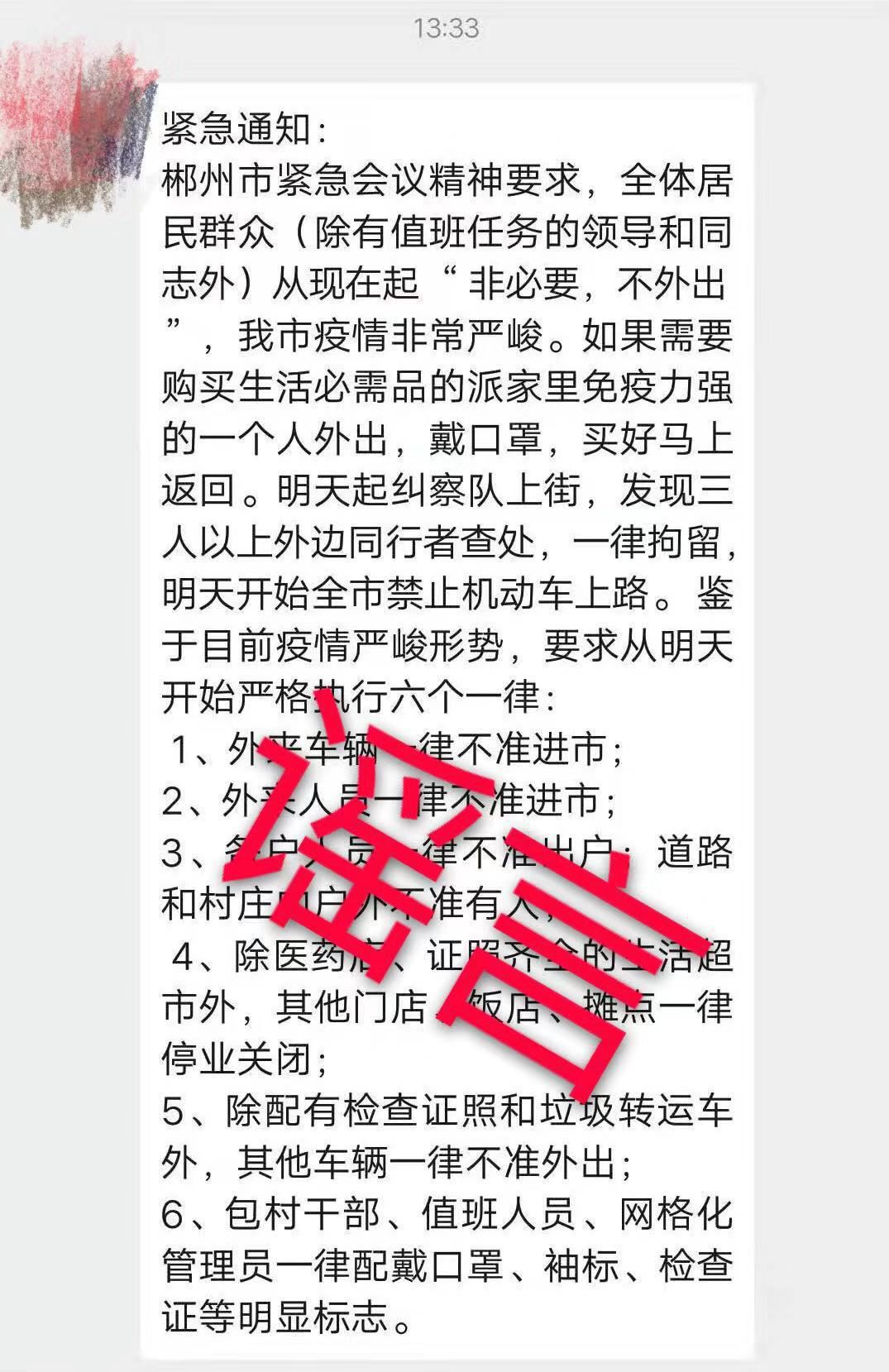 近日,在微信朋友圈传播“郴州市紧急会议要求……明天起纠察队上街……外来车辆一律不准进市……”。经我办向市疫情应急处置指挥部核实,我市并未发布此类通知,该文字信息系谣言,并且类似版本也在多地出现。