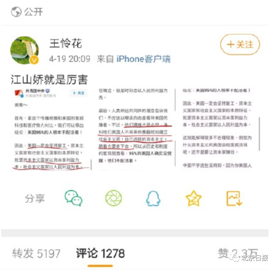20日凌晨,北京日报(ID:Beijing_Daily)注意到,@王怜花已删除相关微博。