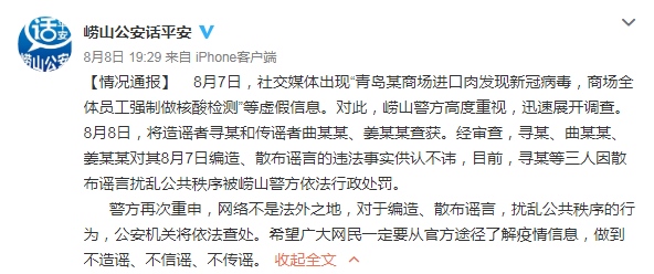 真相:8月8日,崂山公安官方微博辟谣称,网传内容不实。造谣者寻某、传谣者曲某某、姜某某对其编造、散布谣言的违法事实供认不讳。目前,寻某等三人因散布谣言扰乱公共秩序被崂山警方依法行政处罚。