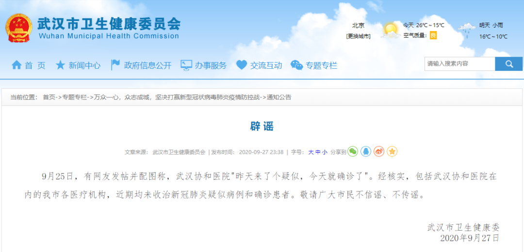 武汉市卫健委官网9月27日消息,9月25日,有网友发帖并配图称,武汉协和医院“昨天来了个疑似,今天就确诊了”。经核实,包括武汉协和医院在内的武汉市各医疗机构,近期均未收治新冠肺炎疑似病例和确诊患者。敬请广大市民不信谣、不传谣。