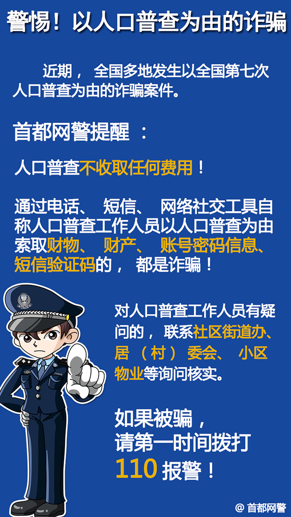 根据该提示,近期,全国多地发生以全国第七次人口普查为由的诈骗案件。警方指出,人口普查不收取任何费用,通过电话、短信、网络社交工具自称人口普查工作人员,以人口普查为由索取财物、财产、账号密码信息、短信验证码的,都是诈骗。