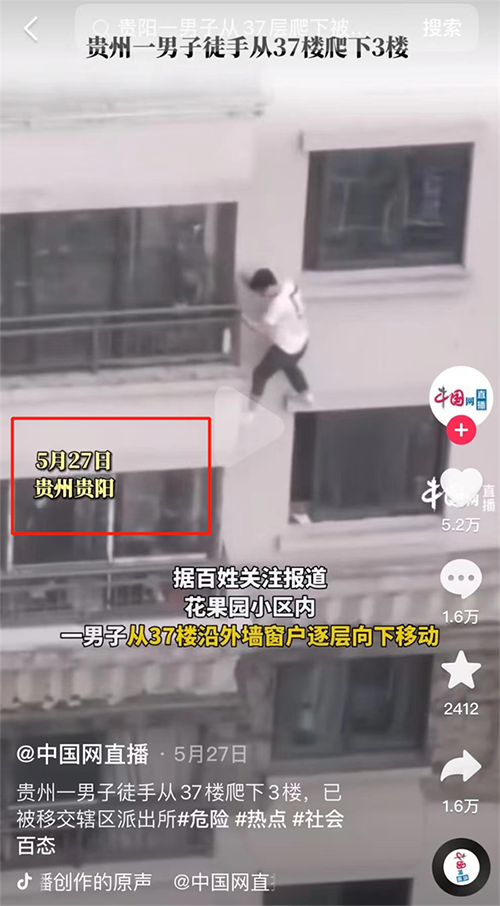 真实情况为,5月27日,一名男子从楼顶爬至3楼,后被消防员救入屋内,当时各大媒体都对此事进行了报道。