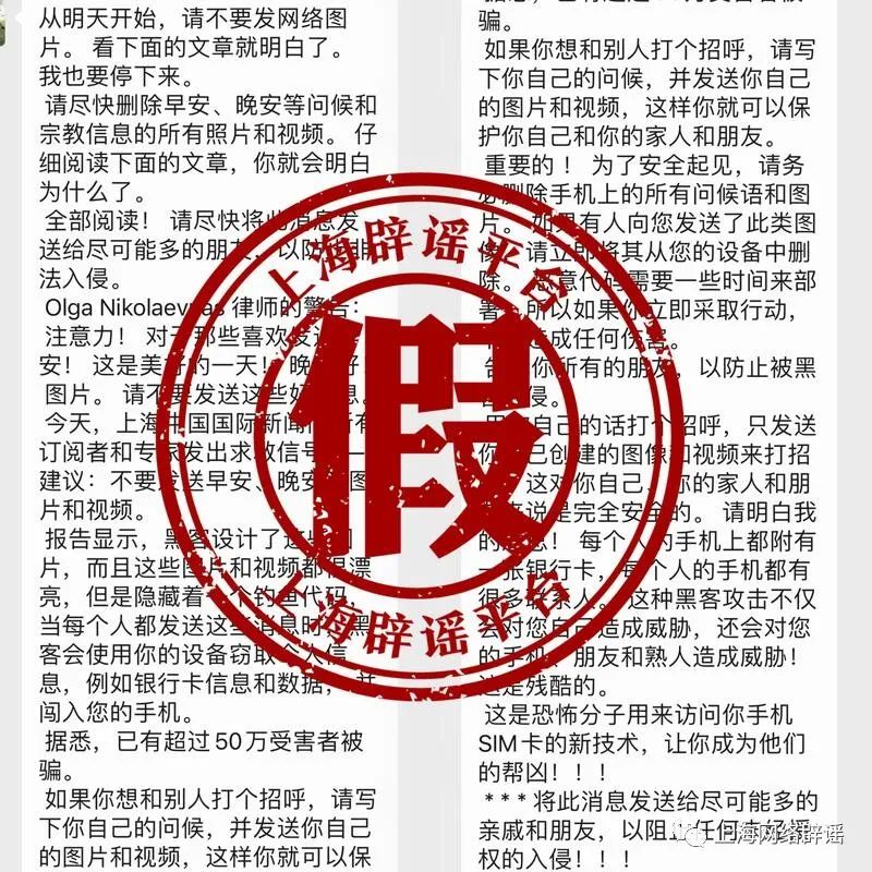 近日,上海辟谣平台收到很多网友询问,一条“从明天开始,请不要发网络图片”的消息到底是不是真的。这条消息非常长,大致意思是各种早安、晚安等问候照片和视频由黑客设计,含有钓鱼代码,发送这些消息时,黑客就能窃取个人信息,已有超过50万受害者被骗。消息还称,这一提醒来自“Olga Nikolaevnas律师”“上海中国国际新闻”“爵士卡拉凯尔”等。