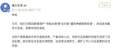 1月18日,珠海格力电器股份有限公司文化传媒中心发布声明:今天,我们注意到微博用户“许韬de微博”发文称“董明珠被停职审查”。该信息纯属无中生有、恶意中伤的谣言。 该用户肆意编造并发布虚假信息,严重误导公众,对我司及高管的名誉权造成了恶劣影响。我司将坚决采取法律措施,追究其法律责任,维护上市公司及高管的合法权益。