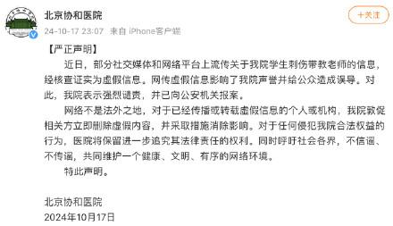 北京协和医院10月17日晚发布声明称,近日,部分社交媒体和网络平台上流传关于该院学生刺伤带教老师的信息,经核查证实为虚假信息。对此,北京协和医院表示强烈谴责,并已向公安机关报案。北京协和医院表示,对于已经传播或转载虚假信息的个人或机构,敦促相关方立即删除虚假内容,并采取措施消除影响。对于任何侵犯该院合法权益的行为,医院将保留进一步追究其法律责任的权利。